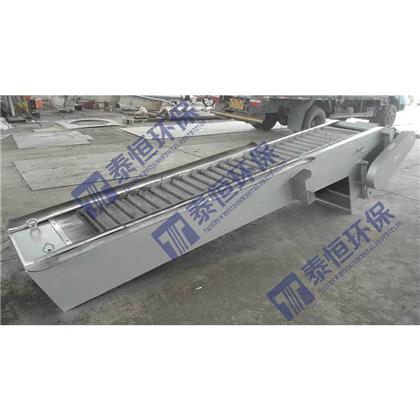 回轉式格柵除污機設備是由一種獨特的耙齒廠裝配成一組回轉格柵鏈。在電機減速器的驅(qū)動下,耙齒鏈進行逆水流方向回轉運動。耙齒鏈運轉到設備的上部時,由于槽輪和彎軌的導向,使每組耙齒之間產(chǎn)生相對自清運動,絕大部分固體物質(zhì)靠重力落下。另一部分則依靠清掃器的反向運動把粘在耙齒上的雜物清掃干凈。按水流方向耙齒鏈類同于格柵,在耙齒鏈軸上裝配的耙齒間隙可以根據(jù)使用條件進行選擇。當耙齒把流體中的固態(tài)懸浮物分離后可以保持水流暢通流過。整個工作過程是連續(xù)的,也可以是間歇的。